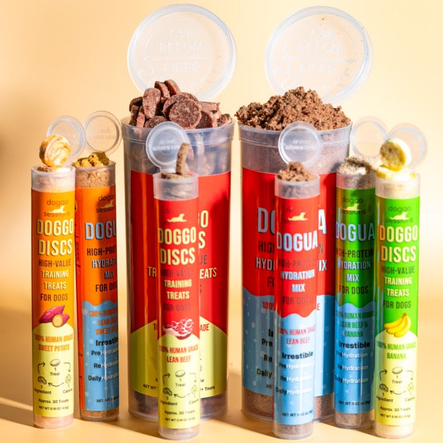 - Treat Tubes and Barrels - remember that saying "the best gym membership is the one you'll use?" Well, in addition to being healthy and high-value, Doggo Discs are the treat you'll use because you can stash them anywhere with their portable, protective, resealable packaging.