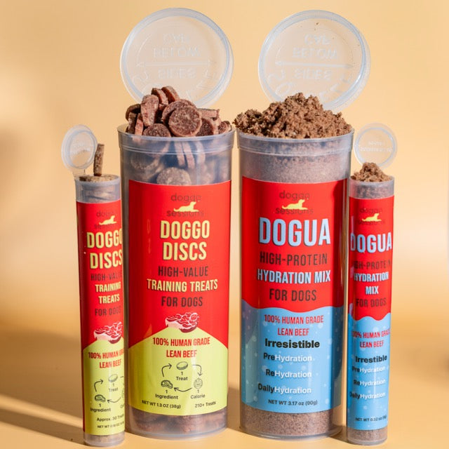 Dogua High Protein Hydration Mix is our concoction to incentivize hydration. Just like our treats – Freeze dried, Human grade ingredients for health and flavor – add a little to your dog's water and watch them lick the bowl clean.